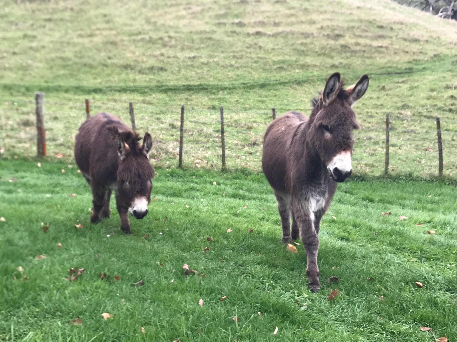 They are half brothers. Nibby is part miniature donkey so is about half the size of Chester.